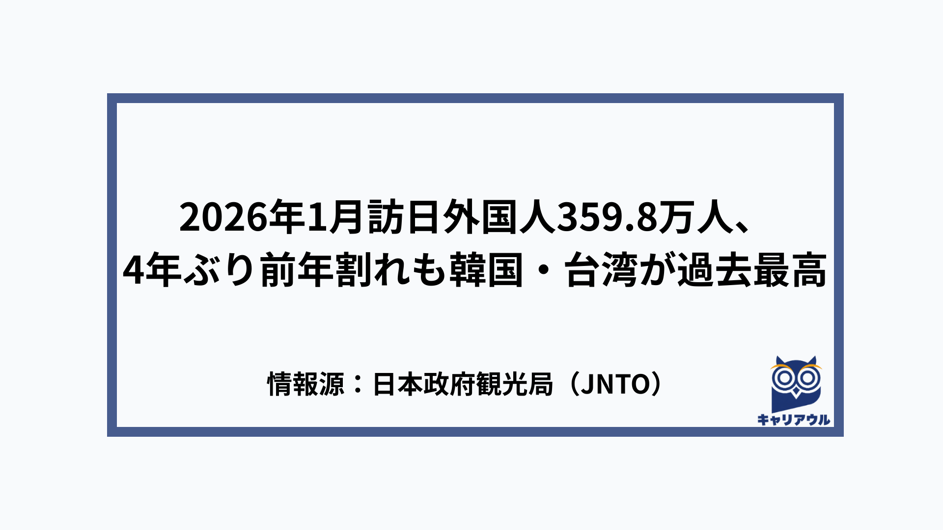 2026年1月訪日外国人359.8万人、4年ぶり前年割れも韓国・台湾が過去最高