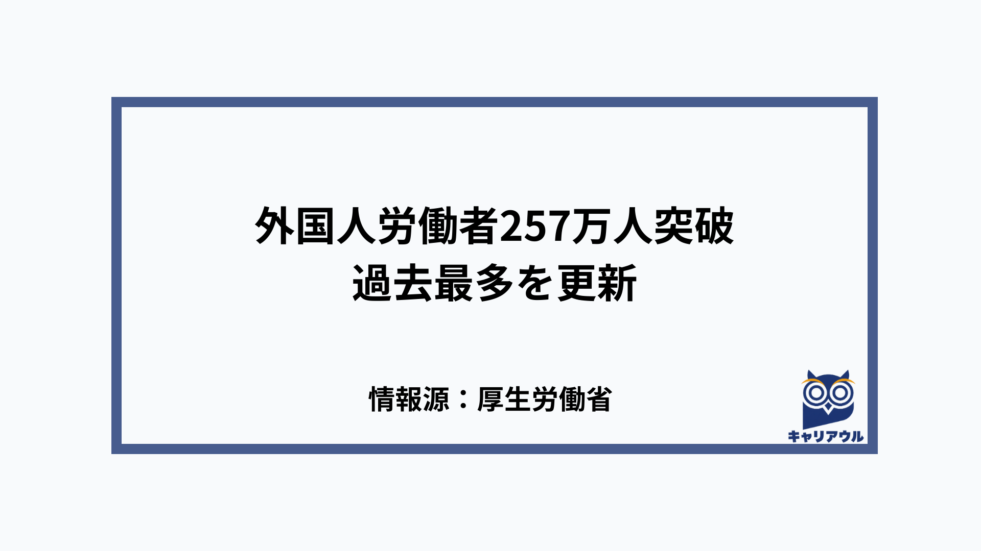 厚生労働省が2026年1月30日に発表した令和7年10月末時点の外国人雇用状況によると、国内で働く外国人労働者数は257万1,037人となり、前年比26万8,450人増(11.7%増)で過去最多を更新した。届出義務化以降13年連続の増加となる。